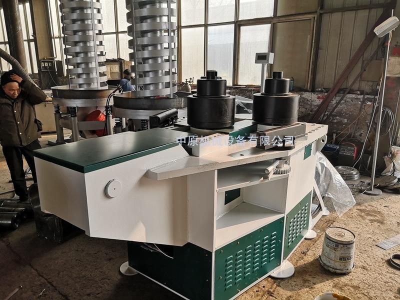 床身為一封閉式框架結(jié)構(gòu),驅(qū)動(dòng)兩輥位置固定,可以進(jìn)行正反方向旋轉(zhuǎn),油缸推進(jìn)??汕昂笠苿?dòng),兩固定模的轉(zhuǎn)動(dòng)為液壓傳動(dòng)、由液壓馬達(dá)驅(qū)動(dòng)。推進(jìn)模由液壓油缸的伸縮來完成。傳動(dòng)平穩(wěn)、安全可靠;在固定模的兩側(cè)設(shè)有托輥裝置,托輥既可以做升降運(yùn)動(dòng),也可以做旋轉(zhuǎn)運(yùn)動(dòng)。配合模具與導(dǎo)向輪同時(shí)作用有利于控制型材的卷制精度。